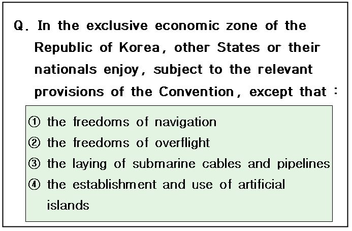 배타적경제수역에서 타 국가는 다음을 향유할 수 있고, 이것은 배제된다고 했다.