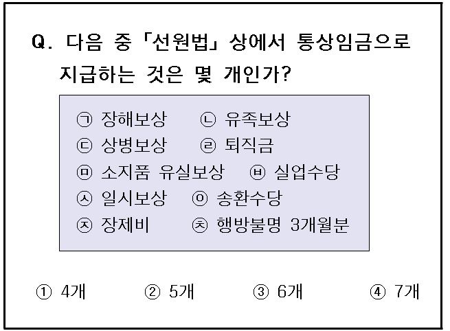 ※ ► 통상임금 : ㉢ 상병보상 ㉤ 소지품 유실보상 ㉥ 실업수당 ㉧ 송환수당