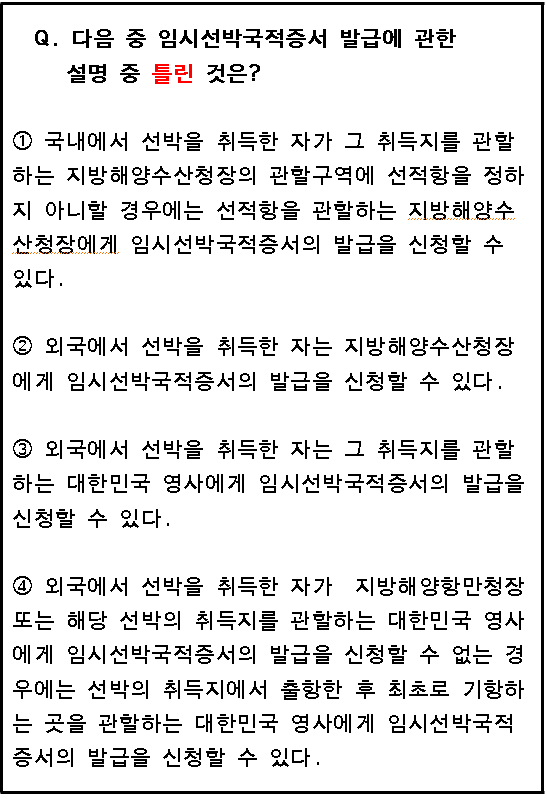 보기①의 경우 취득지를 관할하는 지방해양수산청장에게 임시선박국적증서의