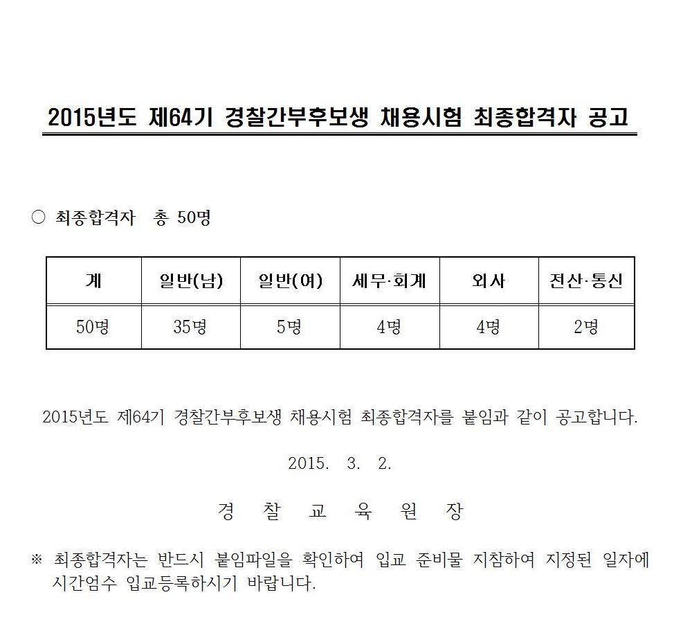 2015년도 제64기 경찰간부후보생 채용시험 최종합격자를 아래와 같이 공고합니다.