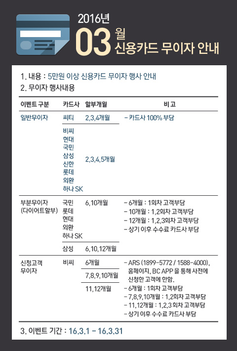 [신용카드] 2016년 3월 신용카드 무이자 안내