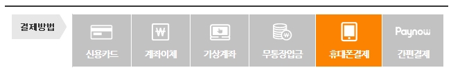 기존의 신용카드, 계좌이체, 가상계좌 및 무통장 입금 방식의 결제 수단에 휴대폰 및 페이나우 (간편결제) 결제 수단을 [아래]와 같이 추가하였습니다.