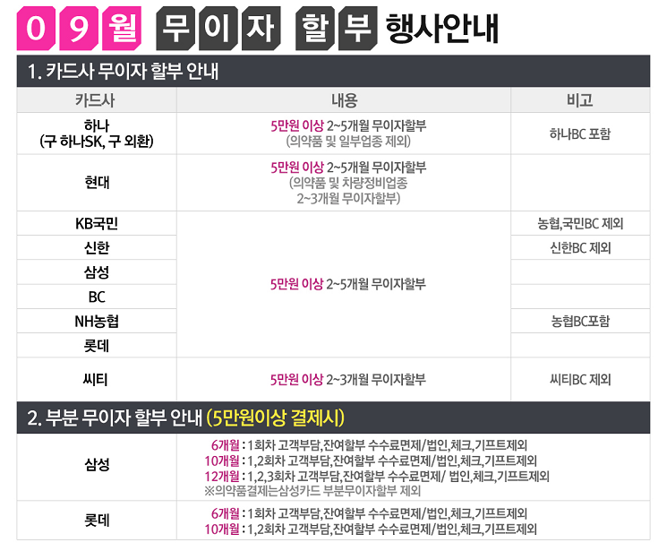 2016년 9월 다음과 같이 신용카드 무이자 할부 행사를 시행하오니 많은 관심과 참여 부탁드립니다.