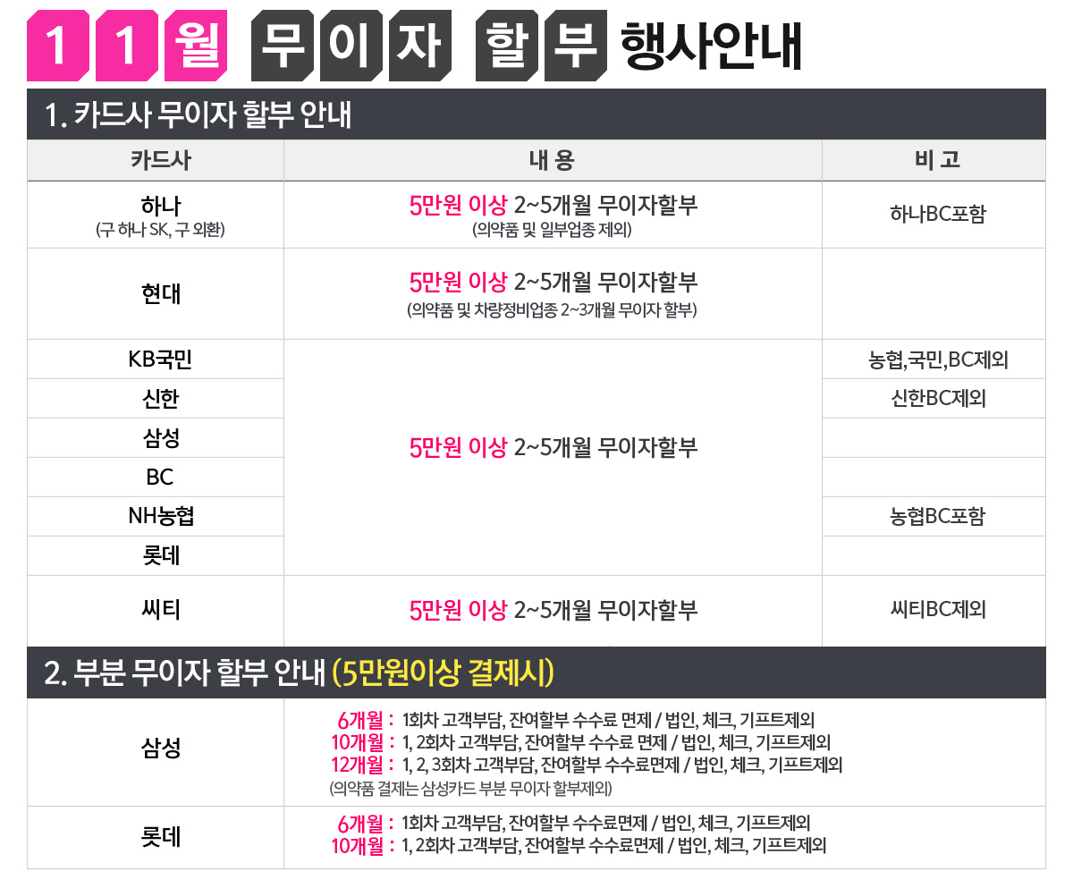 2016년 11월 다음과 같이 신용카드 무이자 할부 행사를 시행하오니 많은 관심과 참여 부탁드립니다.