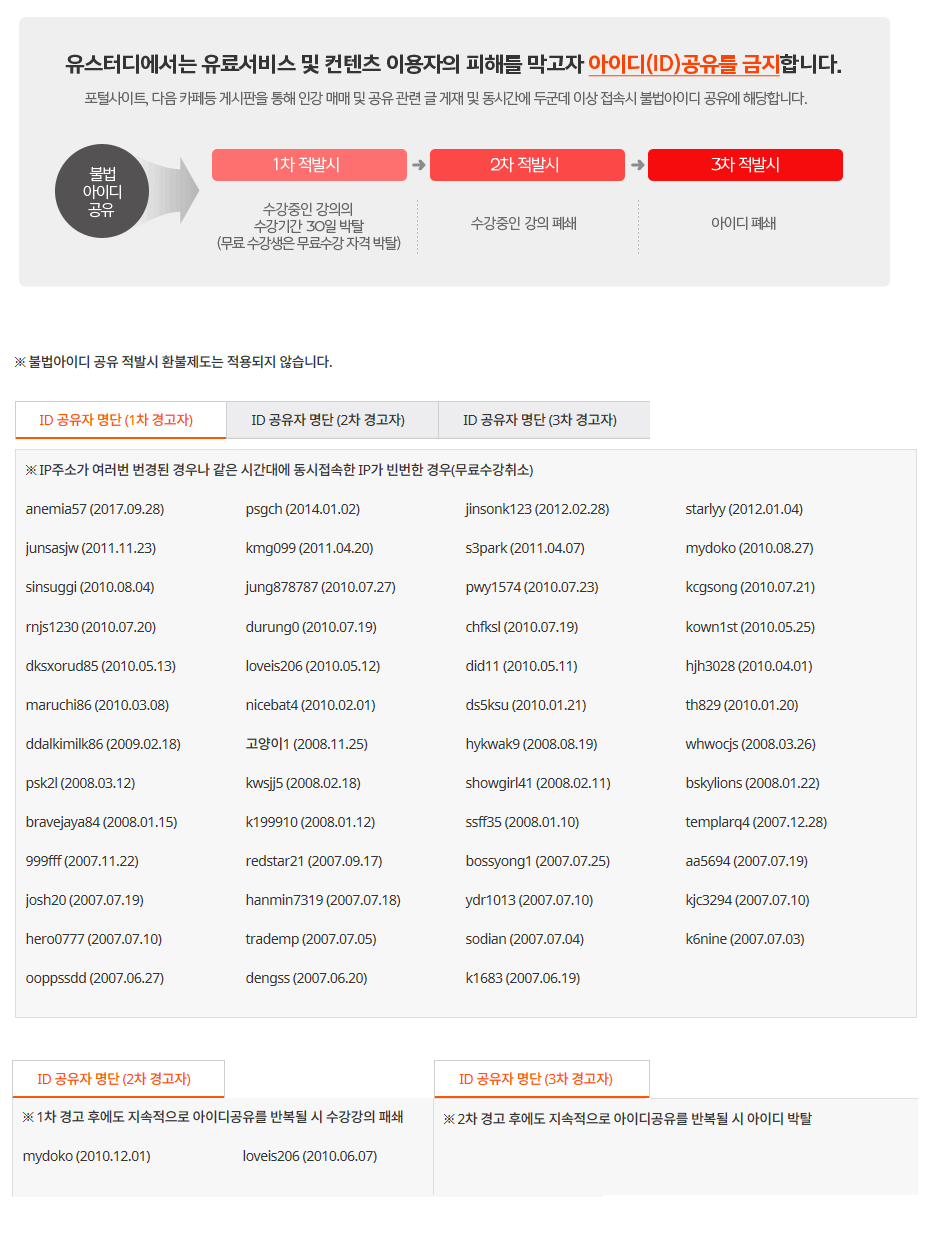 많은 회원님들이 아이디 공유를 하시게 되면 정상적으로 수강하시는 회원들에게 피해가 돌아가게 됩니다. 강의실행 중 심한 버퍼링 현상이나 강의 정지 현상등 많은 부작용이 일어납니다. 따라서 기존 회원의 권리를 보호하고, 불법 사용으로 인해 선의의 피해자가 생기지 않도록 유스터디는 아이디 공유 금지 정책을 실시하게 되었습니다.