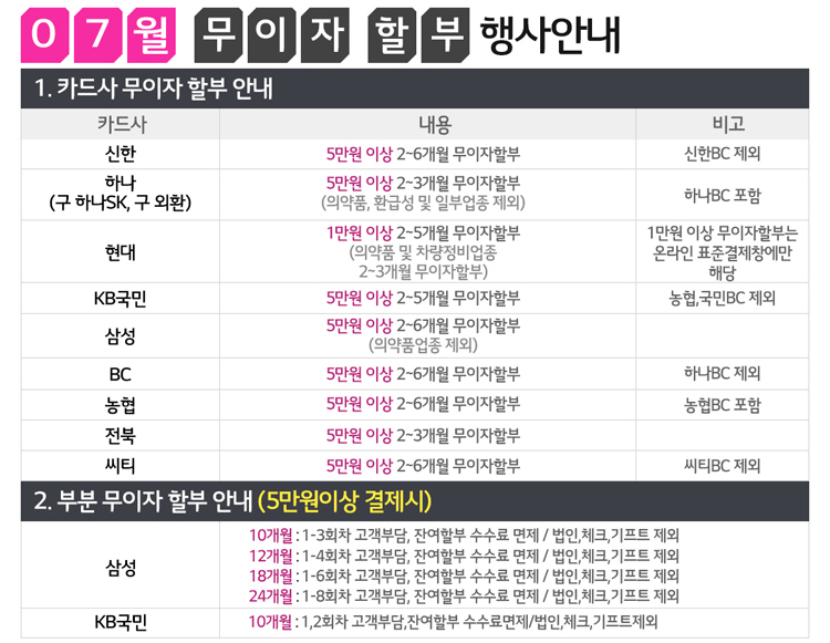 [이벤트]2019년7월 카드 무이자 할부 행사 안내
