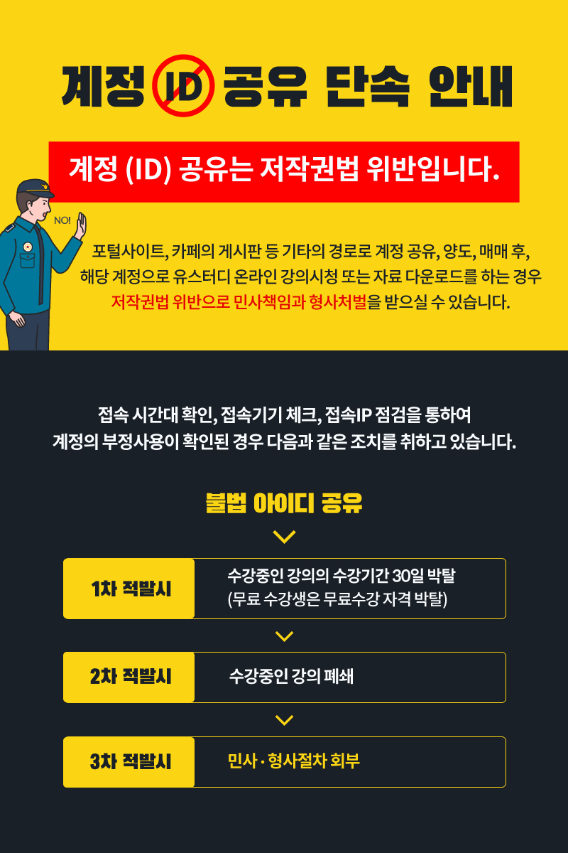 ※ 포털사이트, 다음 카페등 게시판을 통해 인강 매매 및 공유 관련 글 게재 및 동시간에 두군데 이상 접속시 불법아이디 공유에 해당합니다.아이디 불법 공유에 해당하지 않는 경우