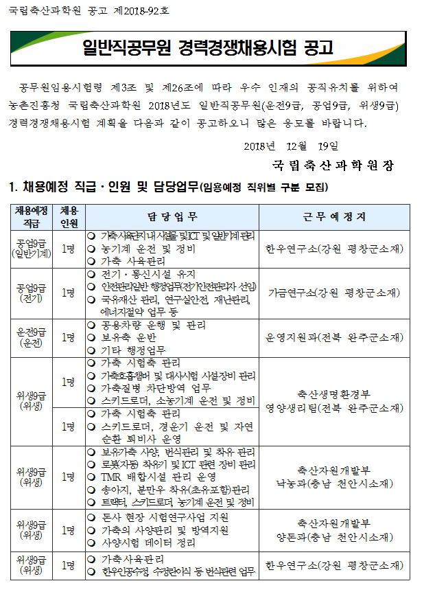 ▶ 국립축산과학원 일반직(공업, 운전, 위생) 9급 경력경쟁채용시험 공고조회수 : 179