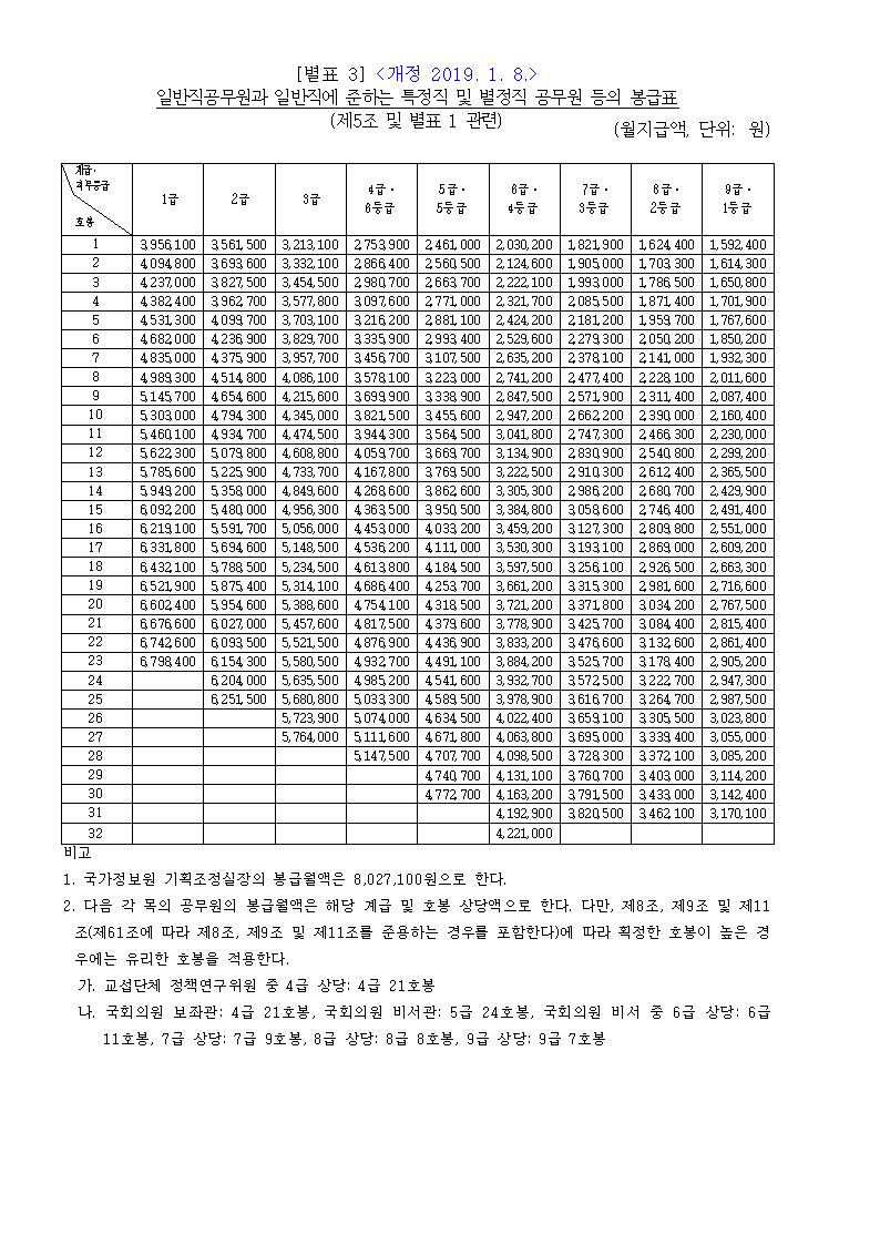 ▶ 2019 일반직공무원, 특정직 및 별정직 공무원 등의 봉급표 (개정 2019년 1월 8일)