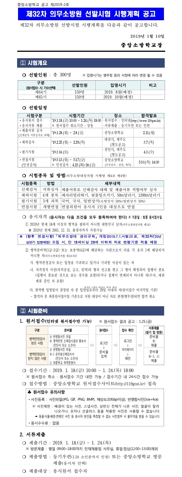 ▶ 제32차 의무소방원 선발시험 시행계획 공고(~2019.1.24)조회수 : 144