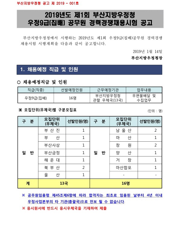 ▶ 2019 부산지방우정청 우정9급(집배) 공무원 경력경쟁채용시험 공고(~1.24)조회수 : 158