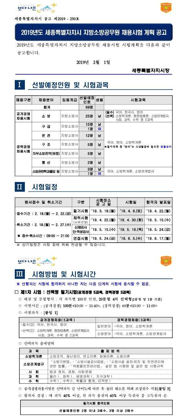 ▶ 2019 세종시 지방소방공무원 채용시험 계획 공고조회수 : 81