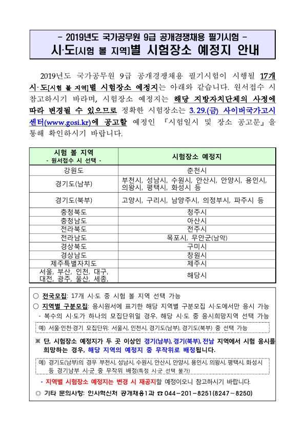 ▶ 2019 인사혁신처 국가공무원 9급 공채 필기시험 시도별 시험장소 예정지 안내조회수 : 130