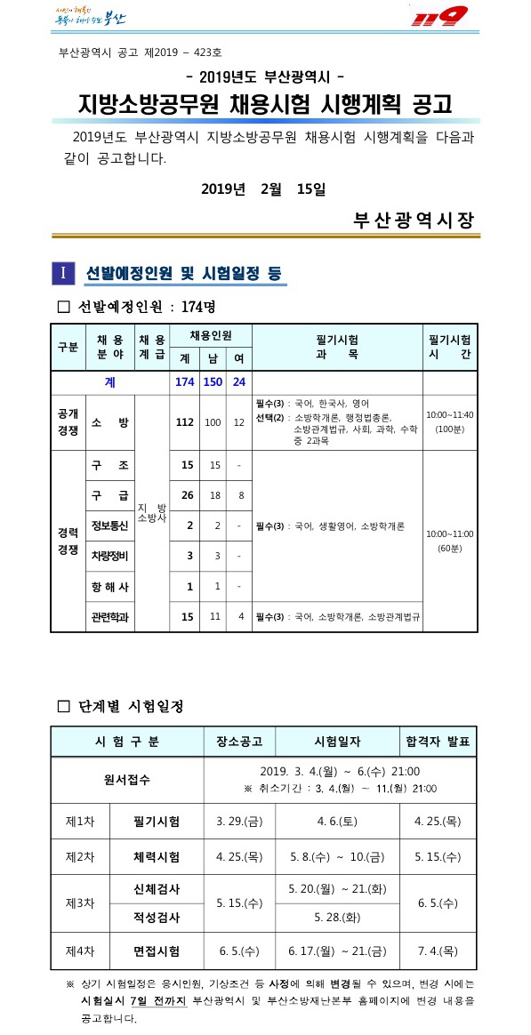 ▶ 2019 부산시 지방소방공무원 채용시험 시행계획 공고조회수 : 149