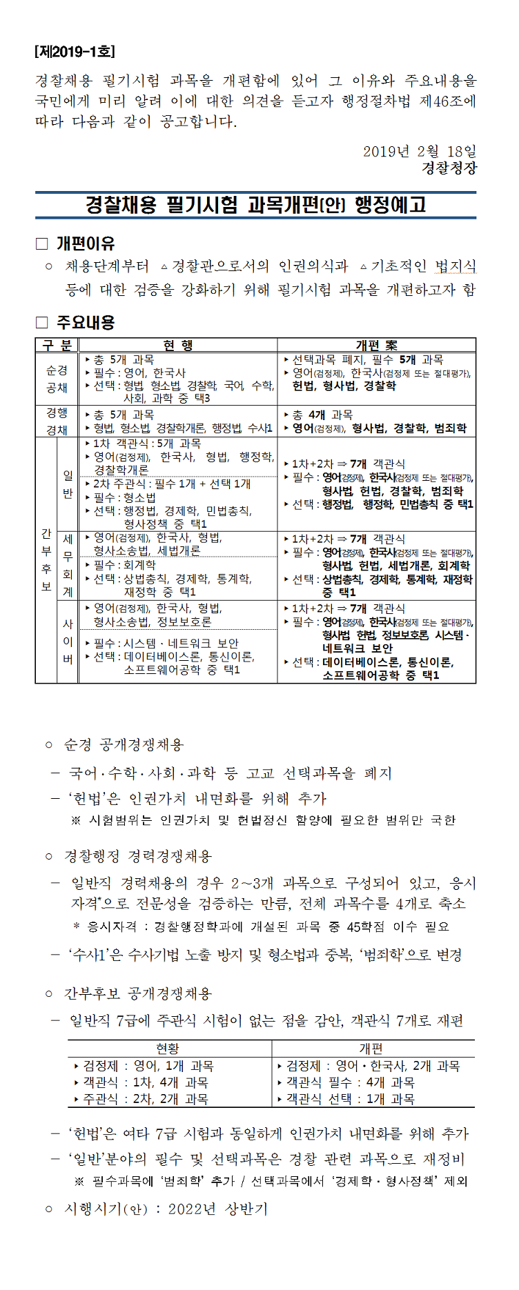 ★ 경찰공무원 필기시험 과목개편 관련 (행정예고)