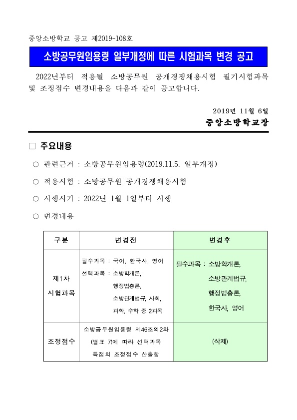 ★ 2022 소방공무원 공개경쟁채용시험 필기시험과목 및 조정점수 변경 공고