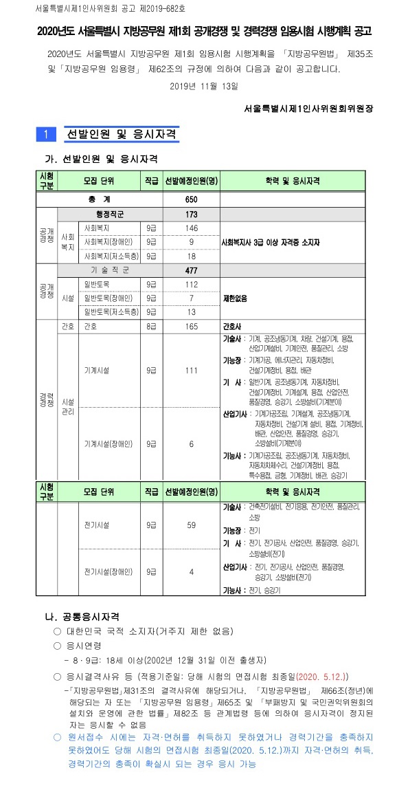 ▶ 2020 제1회 서울시 지방공무원 공개경쟁 및 경력경쟁 임용시험 시행계획 공고