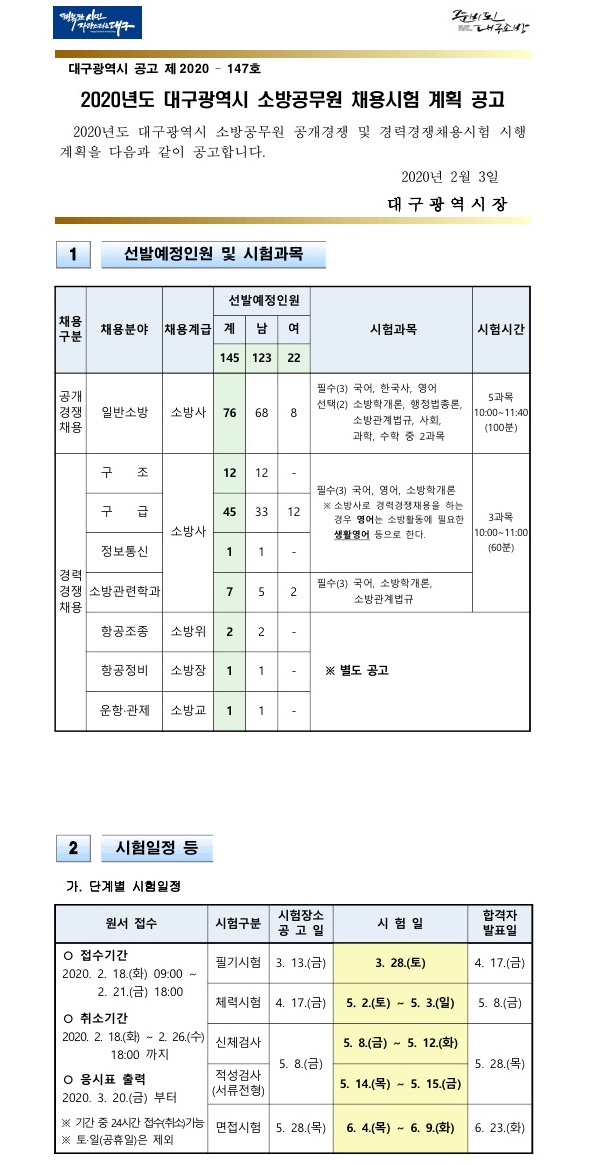 ▶ 2020 대구시 소방공무원 채용시험 계획 공고