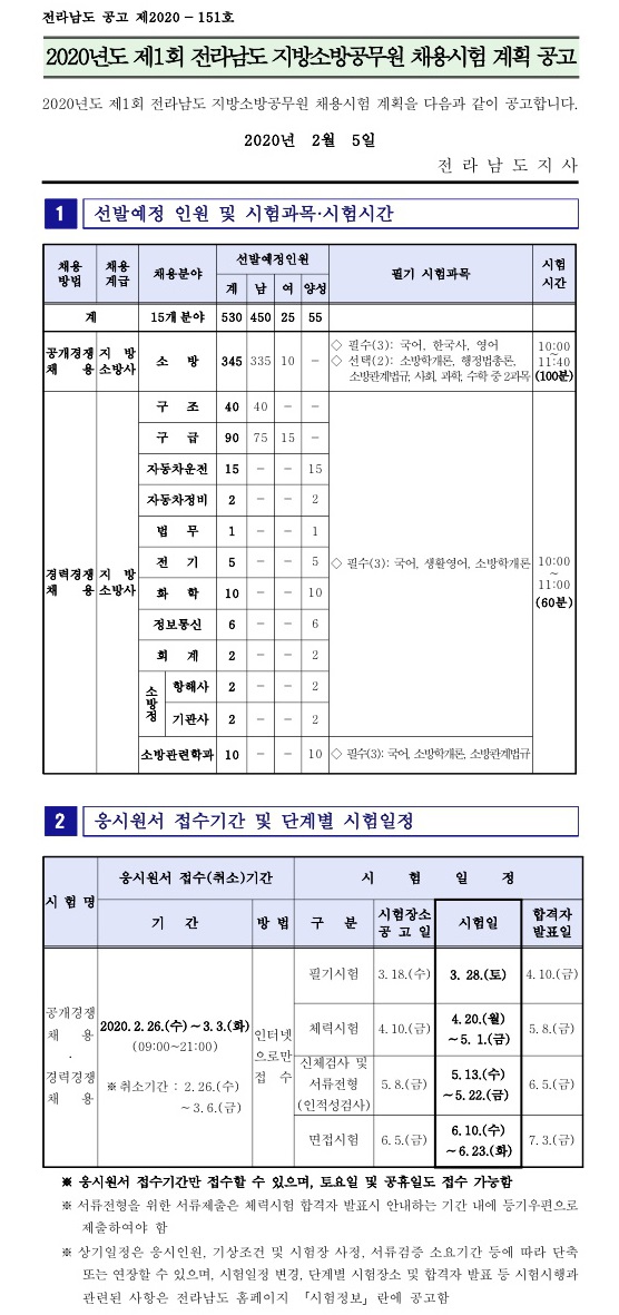 ▶ 2020 제1회 전남 지방소방공무원 채용시험 계획 공고