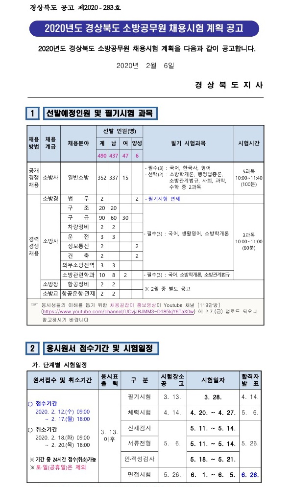 ▶ 2020 경북 소방공무원 채용시험 계획 공고