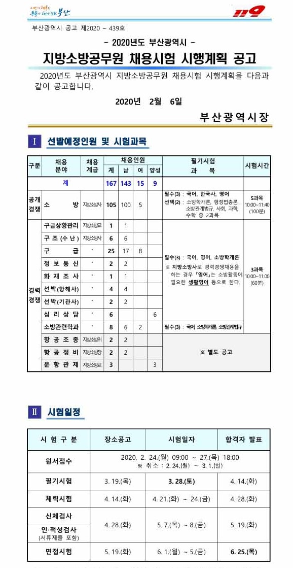 ▶ 2020 부산시 지방소방공무원 채용시험 시행계획 공고