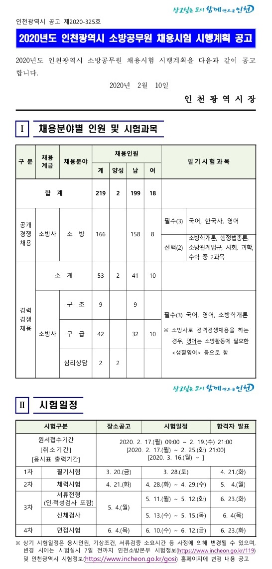 ▶ 2020 인천시 소방공무원 채용시험 시행계획 공고