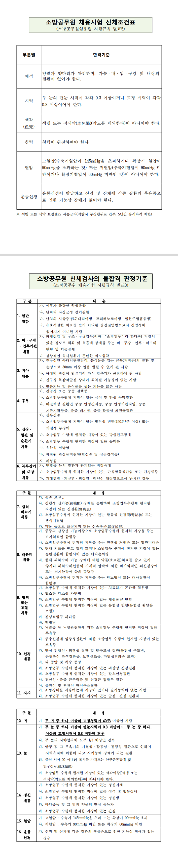 ※ 소방공무원 채용시험 신체조건표 (2020년 기준)