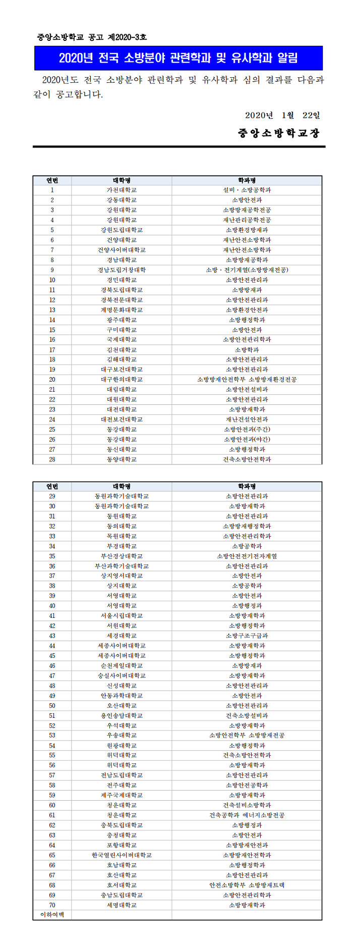 ※ 소방분야 관련학과 및 유사학과 & 소방관련 과목 알림 (2020년 기준)