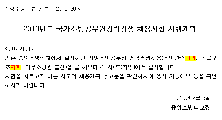 ※ 지방소방공무원 경력경쟁채용은 2019년부터 각 시/도(지방) 에서 실시