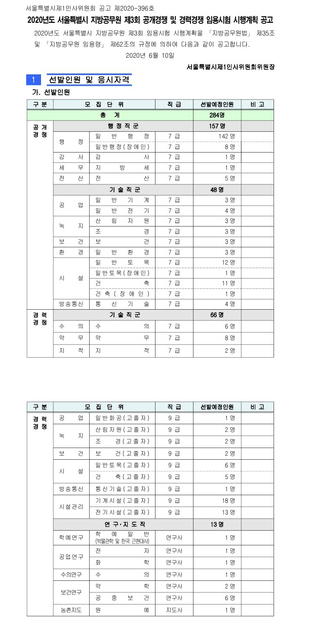 ▶ 2020 제3회 서울시 지방공무원 공개경쟁 및 경력경쟁 임용시험 시행계획 공고