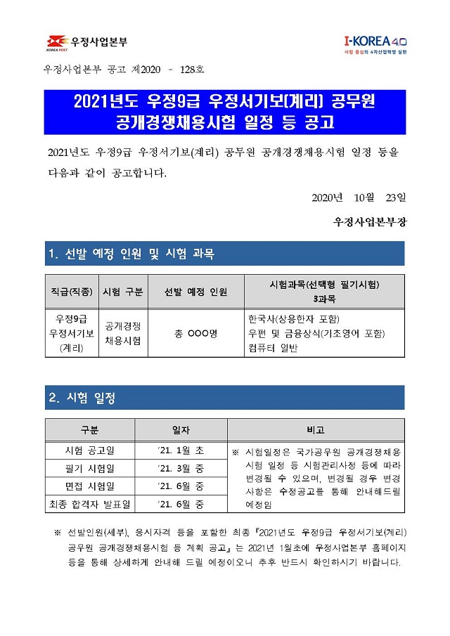 ▶ 2021년도 우정9급 우정서기보(계리) 공무원 공개경쟁채용시험 일정 등 공고