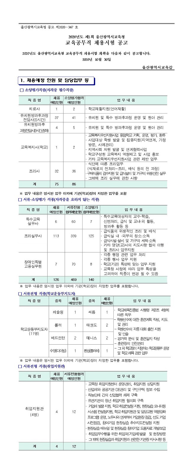 ▶ 2020년도 제1회 울산광역시교육청 교육공무직 채용시험 공고