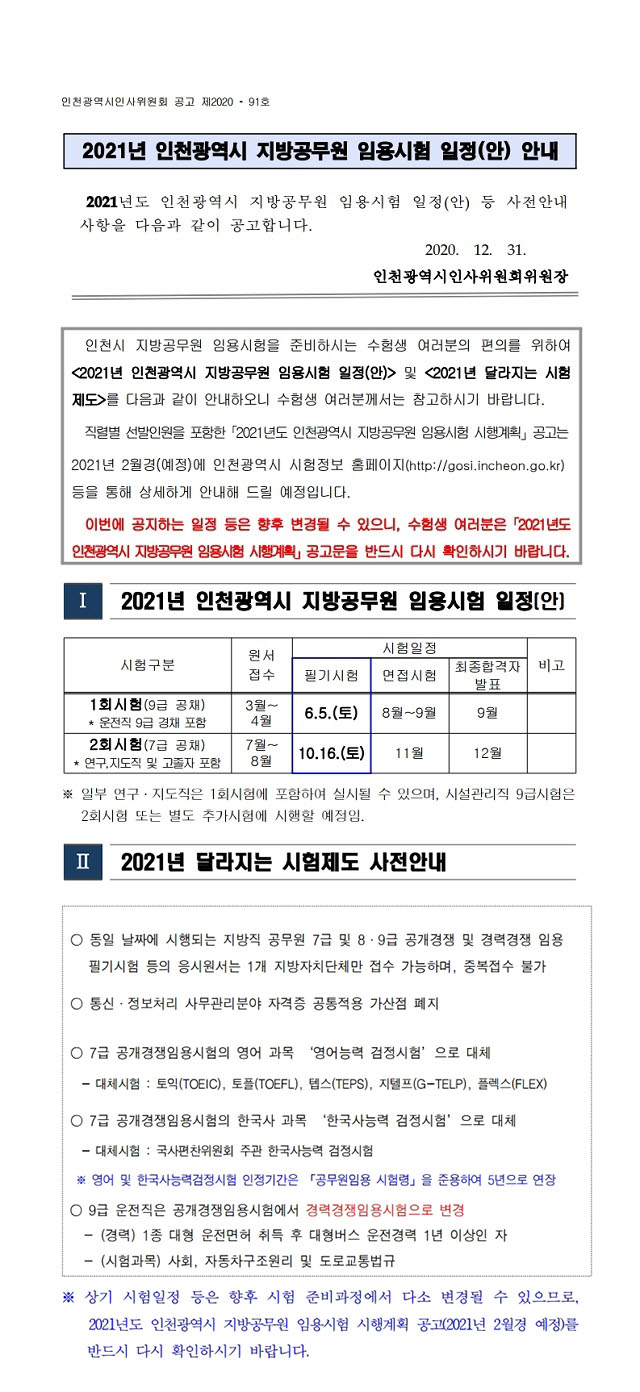 ▶ 2021년 인천광역시 지방공무원 임용시험 일정(안) 안내