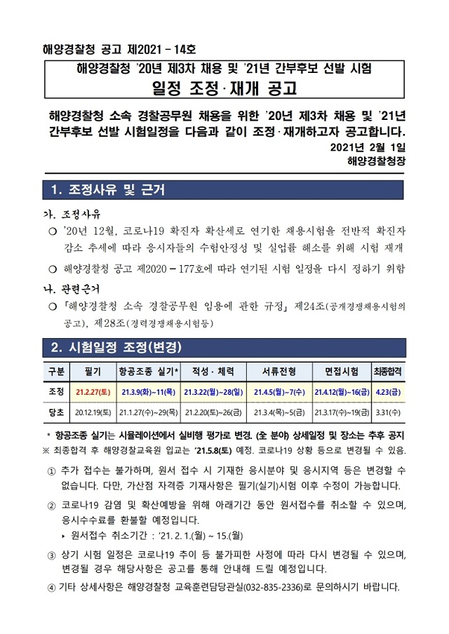 ▶ 2020년 제3차 채용 및 2021년 간후선발 선발 시험 일정 조정.재개 공고