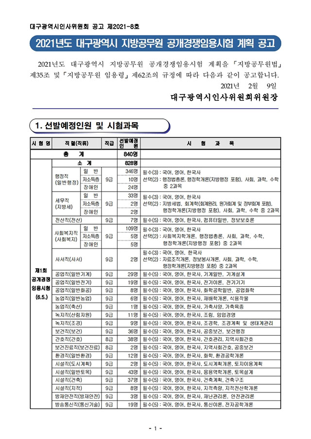 ▶ 2021년도 대구광역시 지방공무원 공개경쟁임용시험 계획 공고