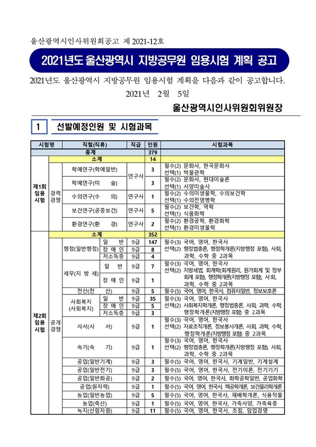 ▶ 2021년도 울산광역시 지방공무원 임용시험 계획 공고
