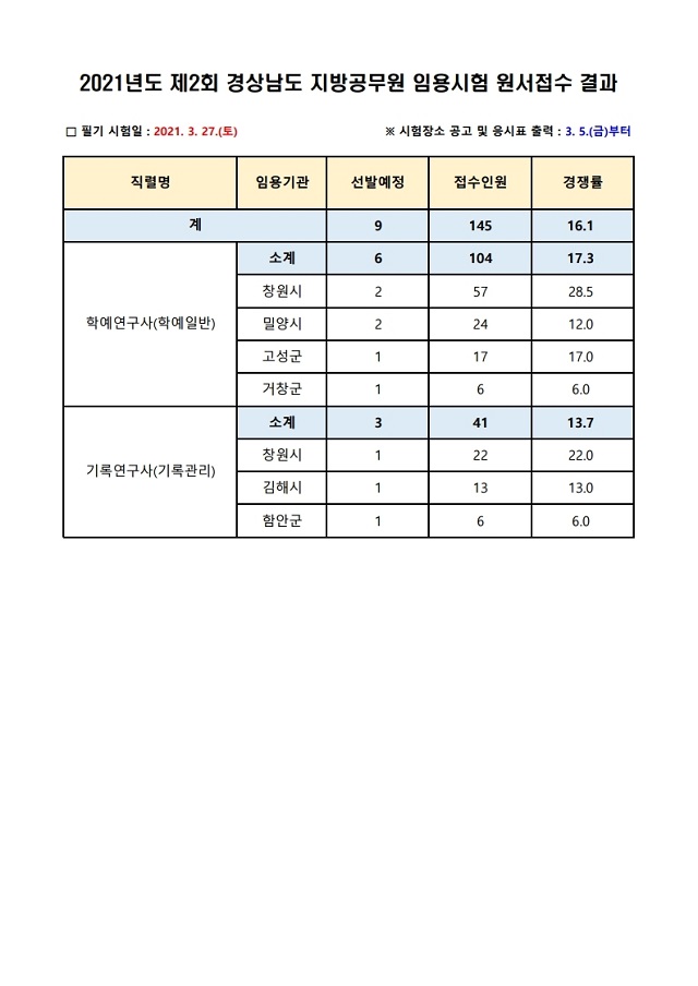 ▶ 2021년도 제2회 경상남도 지방공무원 임용시험 경쟁률