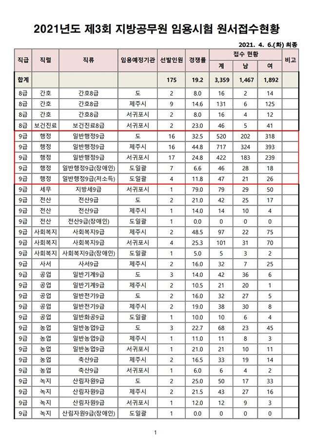 ▶ 2021년도 제3회 제주특별자치도 지방공무원 임용시험 경쟁률