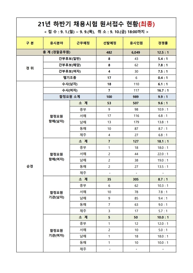 ▶ 2021년 해양경찰 하반기 경찰공무원 및 2022년 간부후보생 채용 경쟁률
