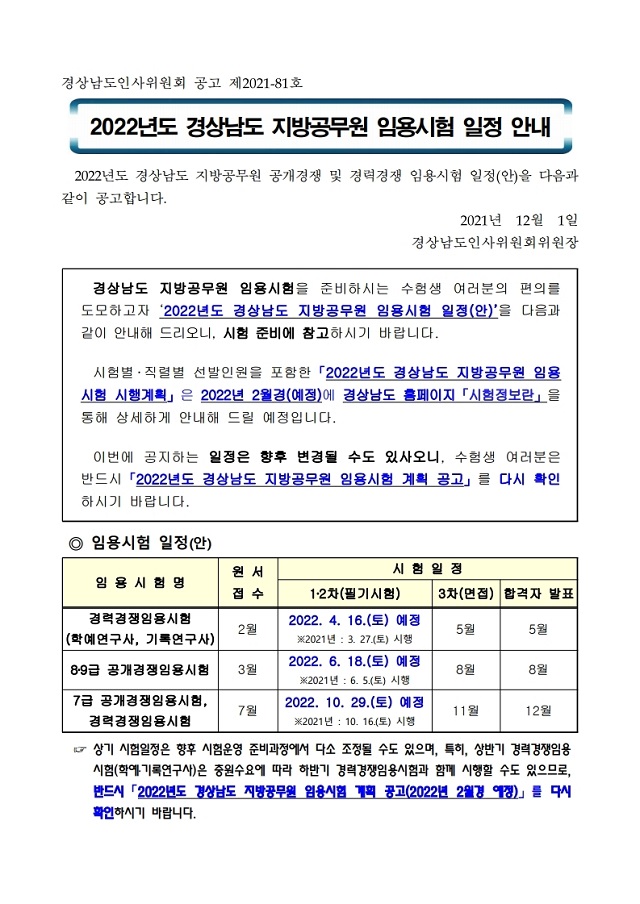 ▶ 2022년도 경상남도 지방공무원 임용시험 일정 안내