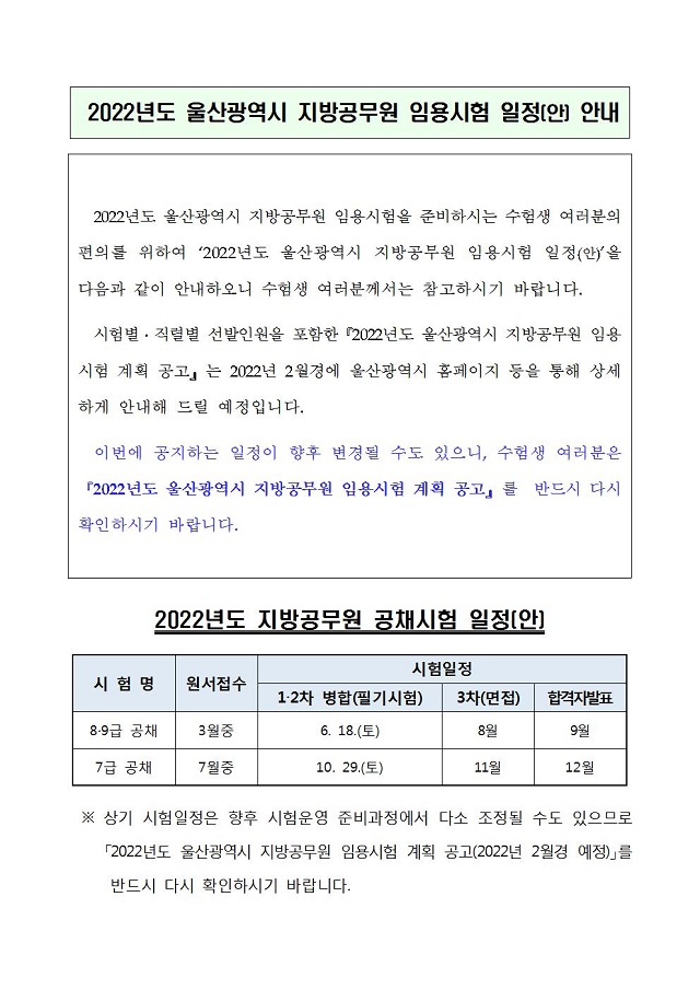 ▶ 2022년도 울산광역시 지방공무원 임용시험 일정(안) 안내