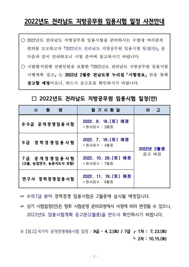 ▶ 2022년도 전라남도 지방공무원 임용시험 일정 안내