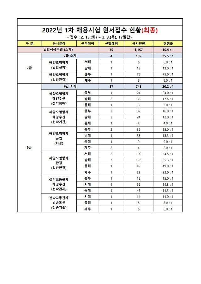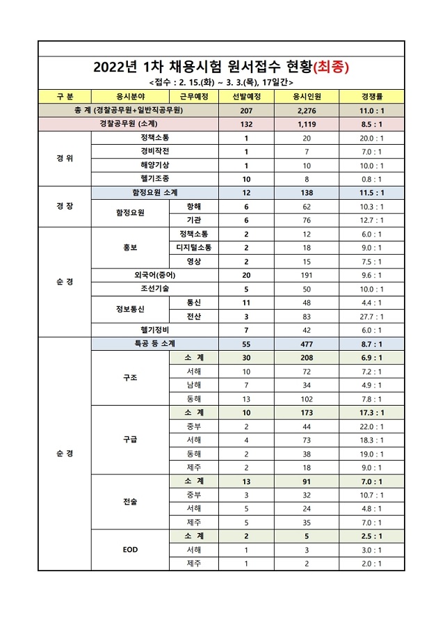 ▶ 2022년 제1차 해양경찰청 소속공무원(경찰직 및 일반직) 채용 경쟁률