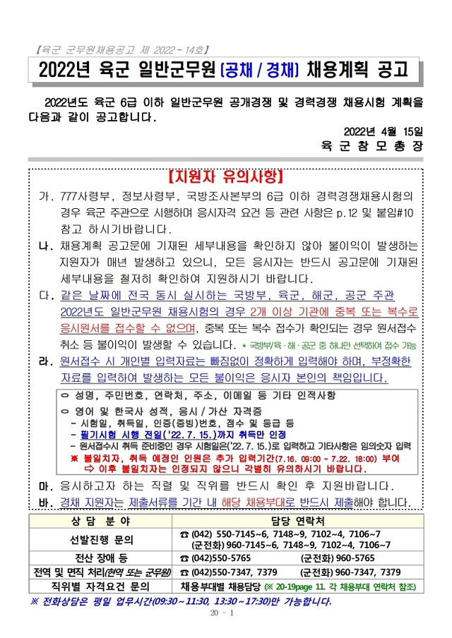 2022년 육군 일반군무원(공채 및 경채) 채용계획 공고.pdf