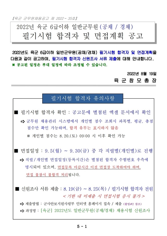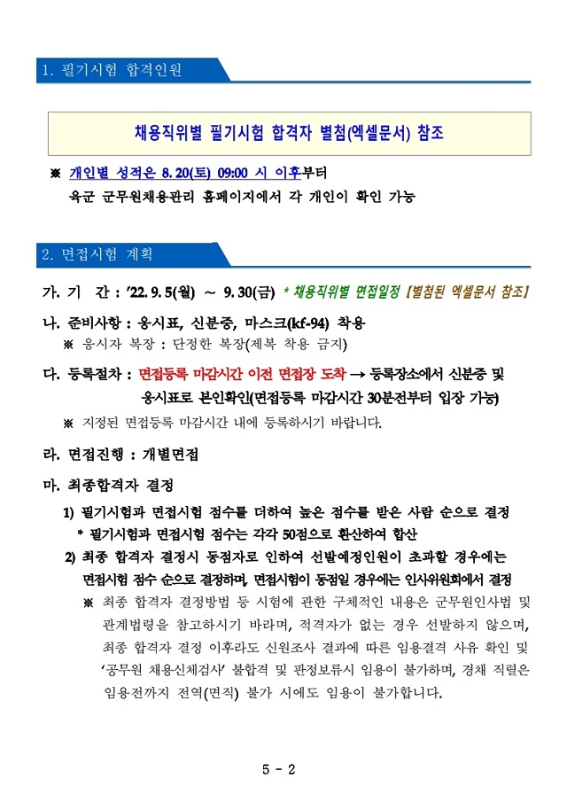 ▶ 2022년도 육군 주관 일반군무원 채용 필기시험 합격선 및 합격자 공고