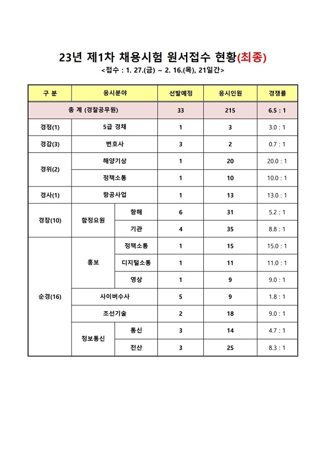 ▶ 2023년 제1차 해양경찰청 경찰공무원 채용 경쟁률