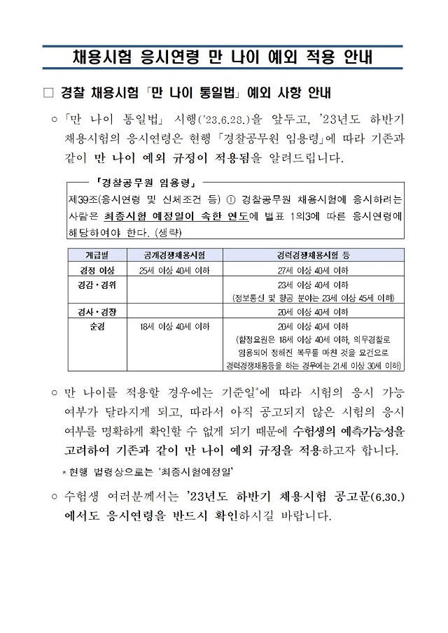 ※ 경찰공무원 채용시험 응시연령 안내 (만 나이 적용 예외)