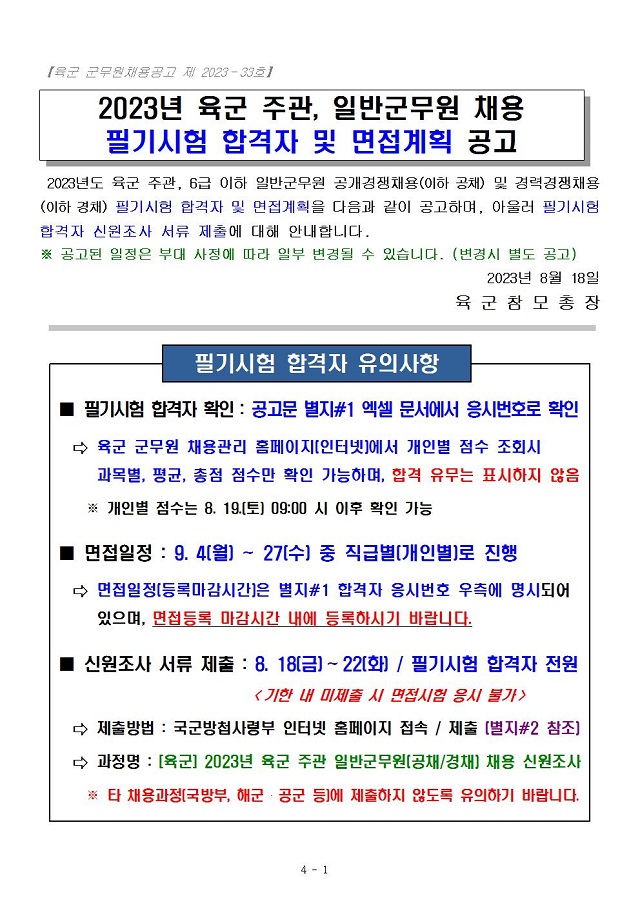 2023년 육군 주관 일반군무원 필기시험 합격자 및 면접계획 공고.hwp