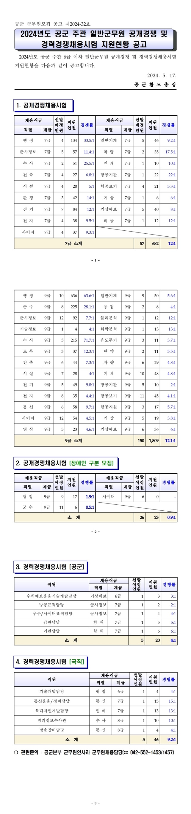 공고24-32 2024년도 공군 주관 일반군무원 공개경쟁 및 경력경쟁채용시험 지원현황(경쟁률) 공고.pdf