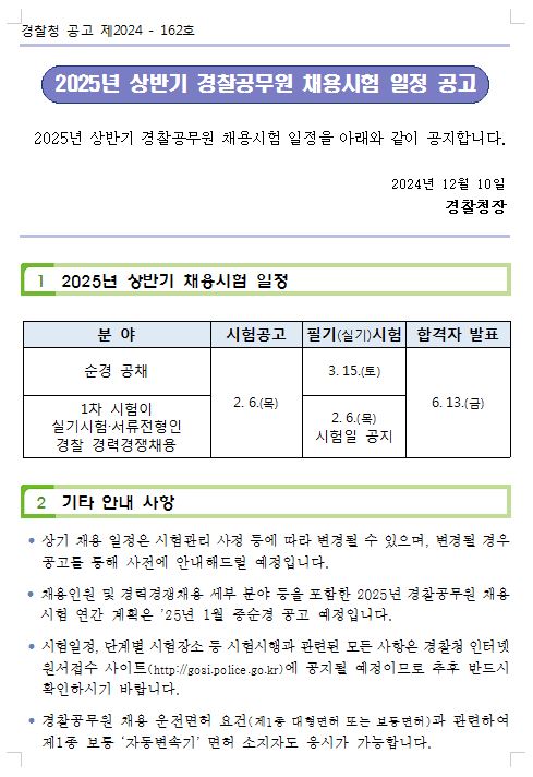'25년 상반기 경찰공무원 채용시험 일정을 [붙임]과 같이 공고합니다.